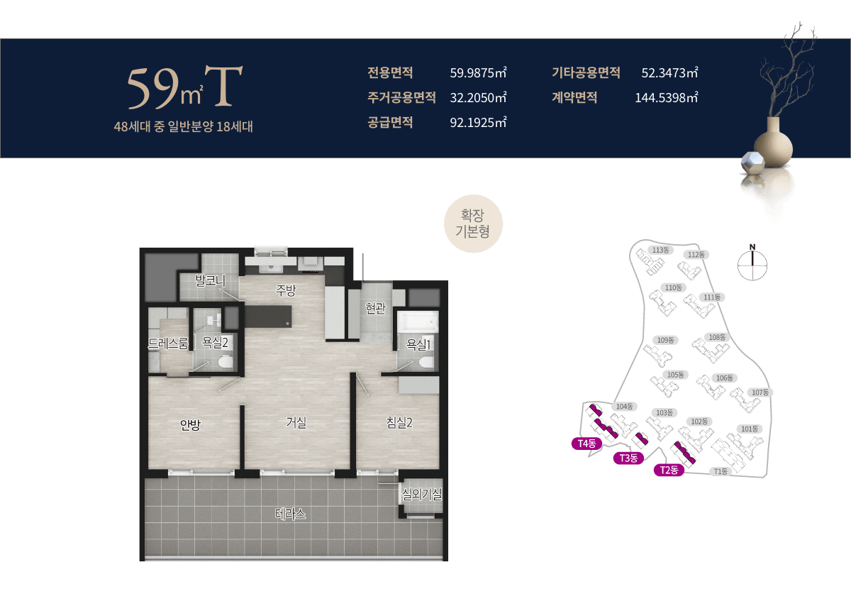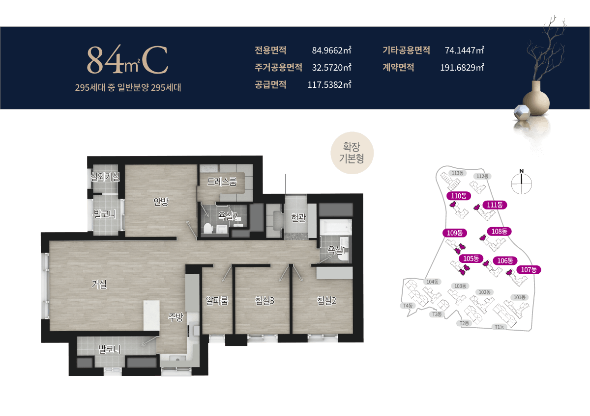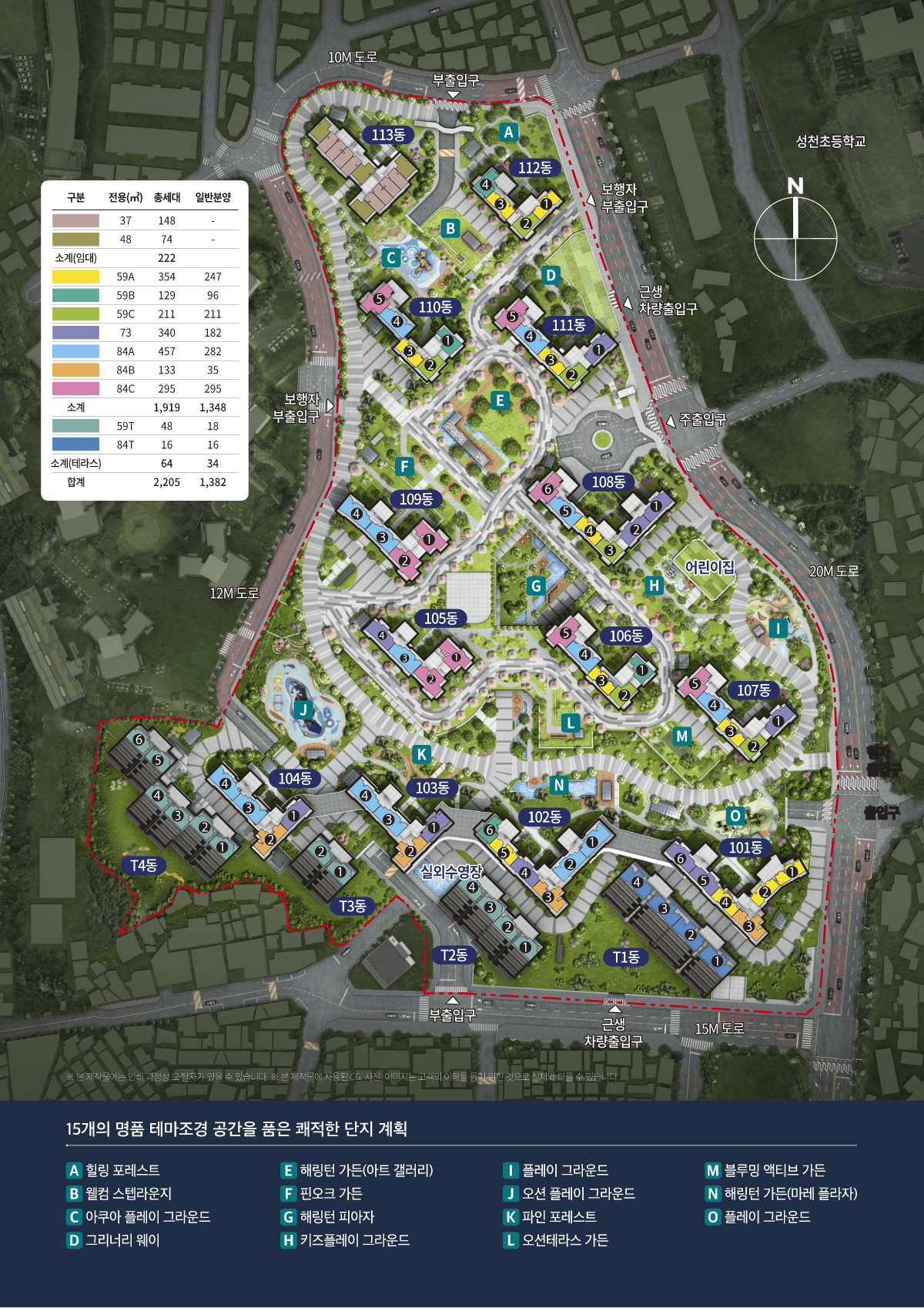 단지는 지하 5층~지상 36층의 고층 빌딩 17개 동으로 구성되며, 총 2,205세대라는 매머드급 규모를 자랑합니다. 대단지의 상징답게 전용 59~84㎡의 실속형 중소형 평면을 중심으로 구성되어 실수요층의 니즈를 충실히 반영했습니다.