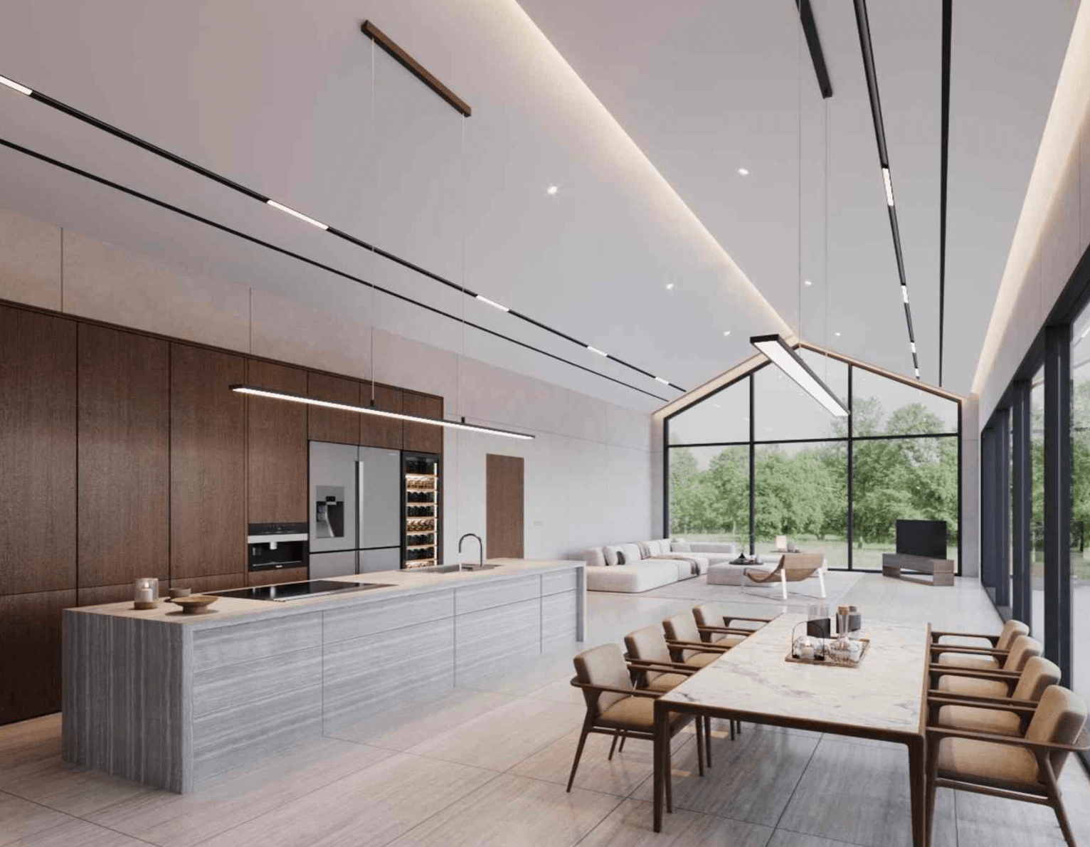 제로에비뉴의 주택은 철근 콘크리트 구조로 내구성이 뛰어나며, 모던한 건축 양식이 돋보입니다. 집 안은 우드와 대리석의 조화로 차분하면서도 고급스러운 무드를 연출합니다. 또한 층고 5.5m의 높은 천장이 넓고 밝은 공간감을 제공합니다.